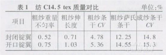 在其他工艺条件不变情况下,封闭锭翼与开口锭翼同台同锭纺C 14.5 tex纱质量对比见表1。