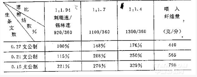 注:以速比1:1.94,生条支数0.27支(即喂入纤维量440克/分)产生的棉结数为100%时,其他各档棉结产生数与之相当百分比。