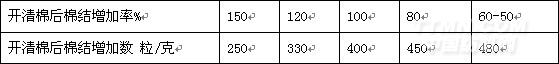 1、在清梳联中,原棉经过开清工序后,棉结随原棉开松度的增加而增加,是纺前准备工序棉结增加的最多的工序。一般开清棉中棉结的增加与原棉中棉结含量相关,当原棉棉结较少时,开清棉工序中棉结增加比率较大。原棉棉结较多时则开清棉后棉结增加反而较低,但不论如何,原棉中棉结含量都是逐渐增加的如表2所示。