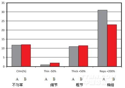 图3纯棉精梳30英支环锭纱骆驼型梳棉机的锡林金属针布纺纱质量较比