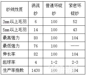 4、产品质量:涡流纺纱线质量特性中,除了纱线强力及伸长率比环锭纱低以外,其它毛羽,起球率等项质量指标匀比环锭纱好,甚至有些指标还要比紧密纱好。但生产纯棉纱质量远不如化纤纱。见表