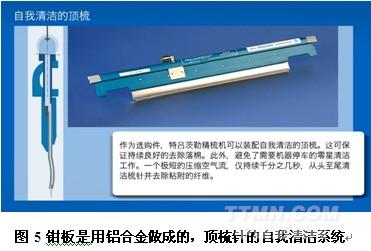 ⑹ 、顶梳针的自我清洁:在生产时顶梳上含有短纤及杂质,增加了顶梳的负荷,以往为此要停机进行清洁,产量会因此减少。特吕茨勒的TCO1型精梳机具有自我清洁顶梳的系统,非常短暂的压缩空气的冲击波(大约只有毫秒级)对顶梳针从上到下的进行净化清洗,把附着在针上的纤维及杂质去除。清除的频率可依据不同的原棉等级而定。立达的E65/E75/精梳机 “Ri-Q-TOP”上顶梳上也有高效自我清洁系统。