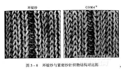 ⑤对于针织物而言,紧密纱由于毛羽少,条干好,可使线圈结构更加清晰,起毛起球显著改善,纱圈横向破坏的纤维明显减少,针织物光洁程度提高(图5—8)。捻系数相同时,紧密纱由于强力高,纤维顺直度高,其针织物在一定程度上有点歪斜。但这个歪斜的外观不仅可以通过降低紧密纱的捻度来补偿,而且还能得到更加柔软的织物手感,提高了服装的档次和舒适性。