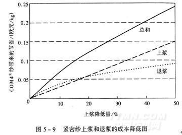 浆纱工序中上浆量的减少和退浆工序的减免可显著降低成本,图 5—9是立达公司所做的紧密纱上浆和退浆的成本降低图。
