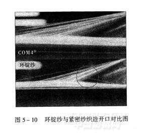 在织机高速化和无梭引纬技术普遍应用的今天,影响纱线可织造性能的有三个因素:一个是纱线的强伸性能,另一个是纱线的耐磨性能,第三个是纱线的毛羽数量。纱线的强伸性能和耐磨性能不好,纱线容易断头,织造速度提不上去,不能实现织机高速化,同时织疵也增多,影响坯布质量。纱线的毛羽数量多,织造开口不清,纱线容易断头,织造速度也提不上去,织机高速化同样不能实现。与传统环锭纱相比,紧密纱毛羽少,强力高、耐磨好,恰恰在这些方面都具有优势(图 5—10)。