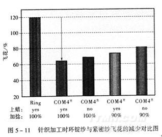 不仅对机织工序具有非常显著的积极影响,而且对针织工序也有明显的正面效果。紧密纱用于针织机上时,由于纱线毛羽少,强力高,织造时断头率降低,停机少,织疵相应减少,针织物质量得到改善,产量大幅增加,针织机效率可显著提高。某些针织产品还可免去常规的上蜡工序,缩短工艺流程,有助于降低生产成本。紧密纱由于毛羽、灰尘、飞花都比较少,因此,针织加工时可改善生产环境,相应减轻清洁工作量(图5—11)。