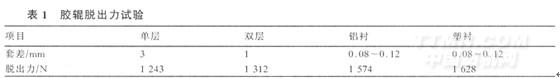 套差是为了保证胶辊和轴承牢固的结合,在使用过程中不脱壳。要保证胶辊的弹性且使其不致于过早的发生蠕变和滞后现象,无套差胶辊是最为理想的。我公司用PA系列塑料合金代替铝衬套,完全可做成铝衬套或优于铝衬套所采用的套差结构。考虑到各使用厂家的轴承公称尺寸不一致,我们采用了0.08mm~0.12mm套差,并进行了脱出力的试验(见表1)。
