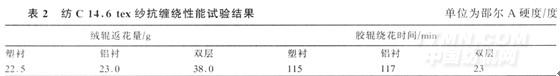 该胶辊在济南诚藤纺织有限公司试验,纺C14.6tex品种的棉纱,运转8h,观察每台车上绒辊返花量,20根断头纺出现胶辊绕花的时间,从以下三个方面来考察HX-0270新型系列工程塑料衬套胶辊的抗绕情况: