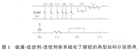 图中:[a]单硫交联;[b)双硫交联;[c]多硫交联[x=3-6];[d]邻位交联[n=1~6];[e]引附属于共同的或相邻的碳原子上的交联;[f]橡胶分子内单硫环;[g]橡胶分子内双硫环;[h]多硫—促进剂侧基;[i]共轭二烯;[j]共轭三烯;[k]附加的网状复物;[1]C-C交联。