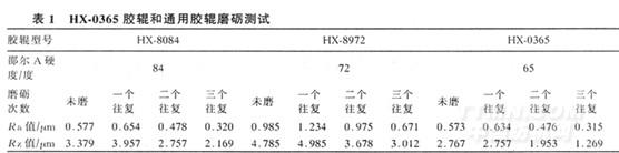 表面粗糙度只9是指物体表面上具有的较小间距和峰谷所组成的微观几何特征,纺纱胶辊表面粗糙度即是表面经磨砺后的微观几何特征,尽管在控制后加工工艺方面起了一定的作用;但胶辊的配方体系和制造工艺的影响是至关重要的,因此我公司控制了胶辊生产配方的硫化体系和生产工艺,生产的产品具有生产所设汁的、生产加工和使用所要求的表面状态。HX-0365胶辊和通用胶辊用同一台磨床和相同的磨砺工艺进行磨砺测试,结果见表1。