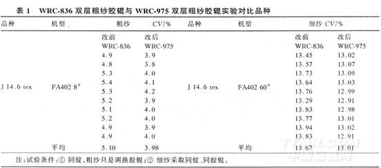 WRC-836双层粗纱胶辊与WRC-975双层粗纱胶辊试验对比结果见表1。