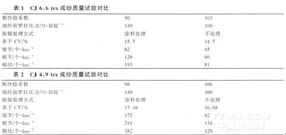 生产过程中,我们设计两种工艺,分别在CJ6.6 tex和CJ4.9tex两品种上试纺,试验结果分别见表1、表2。