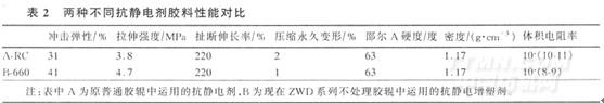 由于原抗静电剂的抗静电效果差、胶料操作安全性差,所以将抗静电和增塑剂合二为一。且由于增塑剂的迁移造成胶辊硬度上升、弹性降低,胶辊易老化龟裂;我们选用了高分子量的抗静电剂,集静电增塑于一体,使胶料的各项性能明显得到提高(特别是强度和弹性明显提高约30个百分点),具体见表2。