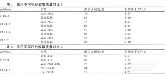 由表1、表2可以看出,粗纱采用表面不处理中等硬度胶辊能改善粗纱条干CV值。原因是其弹性好、硬度低,具有较高的分散度,在相同压力作用下,与罗拉接触具有较大的弧面,加强了对纤维的控制,提高了粗纱条干均匀度。