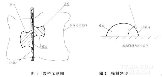 当空气中水分含量和气压不变的条件下,气温降低到使空气达到饱和时的那个温度称为露点温度(简称露点),气温降至露点以下,水汽发生沉降凝结现象,在车间过道、门等处由于冷热交换最易发生此类现象,使胶辊表面形成水雾和纤维产生液桥吸附纤维。改性、预处理材料能降低胶辊表面张力,极大地减小胶辊表面对水的润湿接触角θ(见图2),使水在胶辊表面充分散开抑制液桥产生。