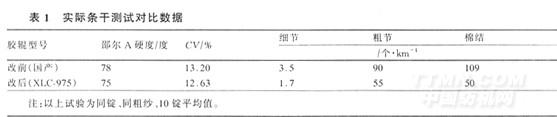 公司在2003年7月中旬,试用一台车WJ465抗绕表面不处理胶辊,取得良好纺纱效果,于2003年11月中旬推广应用11台车,经大面积使用证实,该胶辊成纱质量始终稳定在条干5%水平以内,上车不产生中凹变形,硬度稳定,抗绕性好,回磨周期控制在六个月左右。