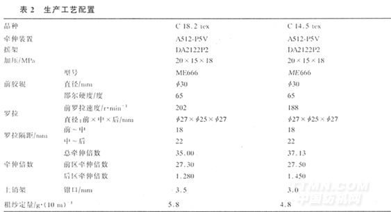 2.2 为实现“重加压、强控制”的工艺原则,经技术人员研讨后首先确定罗拉采用直径为27 mm× 25mm×27 mm的原则,最终选择了A512—P5型牵伸传动形式装置。其总牵伸倍数为7.379—49.6;后牵仲倍数为1.12~1.69。