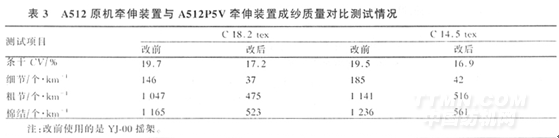 分别在A512原机上和A512P5V两种牵伸装置的细纱机上对C18.2 tex和 C 14.5tex两个品种进行同机台、同锭、同粗纱成纱质量对比试验,其结果见表3。