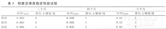 从以上可以看出,胶辊纺纱4个月内中凹不大于0.008 mm;连续6个月内中凹不大于0.02 mm,与国外铝衬产品耐磨性能相当;使用六个月硬度变化仅2度,与国外产品质量水平等同。