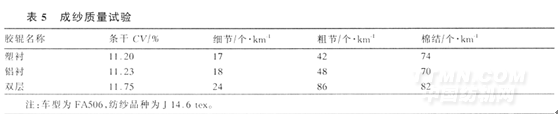该胶辊与美国铝衬胶辊、双层胶辊在五莲棉纺织厂进行了纺纱品质试验,数据见表5;条干质量水平稳定在乌斯特2001公报25%的水平上。