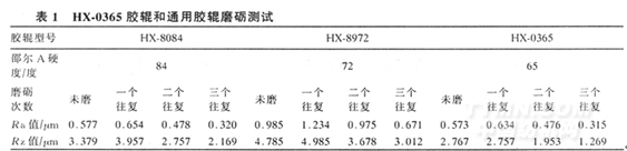 表面粗糙度只9是指物体表面上具有的较小间距和峰谷所组成的微观几何特征,纺纱胶辊表面粗糙度即是表面经磨砺后的微观几何特征,尽管在控制后加工工艺方面起了一定的作用;但胶辊的配方体系和制造工艺的影响是至关重要的,因此我公司控制了胶辊生产配方的硫化体系和生产工艺,生产的产品具有生产所设汁的、生产加工和使用所要求的表面状态。HX-0365胶辊和通用胶辊用同一台磨床和相同的磨砺工艺进行磨砺测试,结果见表1。