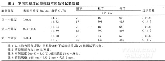 从以上数据可以看出,表面粗糙度值大,摩擦力大,有利于控制纤维,但绒辊花增多,断头机率上升;表面粗糙度值小,纤维在胶辊表面打滑,对纤维运动不能很好的控制,容易出硬头,使成纱质量下降。我公司设计的产品经二个往复的磨砺,条干质量水平稳定在乌斯特2001公报25%的水平上。