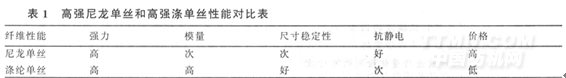 如前所述,网格圈所用的原料是化学纤维,且必须具有较高的强力和耐磨性能,而且还要一定的细度;否则难以保证织物的孔隙度;同时又要尺寸稳定,不产生静电吸附。要同时满足这些要求的产业用化学纤维可供选择的只有两种:高强尼龙单丝和高强涤单丝。这两种材料性能简要对比见表1。