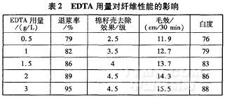 纤维素酶用量为3g/L,渗透剂JFC用量2g/L,双氧水及烧碱用量均为10 L,考察EDTA用量的影响,结果见表2。