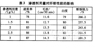 纤维素酶用量3g/L,EDTA用量2g/L,双氧水及烧碱用量均为l0g/L,渗透剂JFC用量的影响见表3。