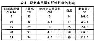 纤维素酶用量3g/L,EDTA用量2g/L,渗透剂JFC用量2g/L,烧碱用量l0 L,双氧水用量的影响见表4。