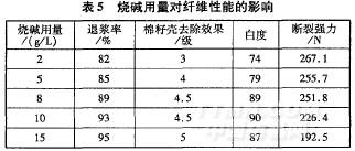 纤维素酶用量3g/L,EDTA用量2g/L,渗透剂JFC用量2g/L,双氧水用量15 L,考察烧碱用量对前处理效果的影响,见表5。
