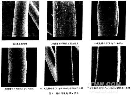图4为棉纤维经胶原蛋白溶液处理前后的纵向形态。图4中(a)和(b)显示普通棉纤维表面较光滑,而经胶原蛋白溶液处理后表面出现明显的剥损条痕,并伴有块状的附着物。经低浓度(1.5g/LNalO)高碘酸钠氧化后的棉纤维表面出现沿纤维轴向的S形或Z形条纹,这可能与棉纤维天然转曲的特性有关。当氧化剂浓度较高(10.7g/LNalO)时,纵向条纹加深且变得不规则。这是由于起选择性氧化作用的10先向纤维的无定形区渗透、扩散及反应,随着氧化程度的加深,氧化反应由纤维的无定形区向晶区进行,所以纤维表面纵向条纹随着氧化程度的加剧而逐渐加深。同时,棉纤维素氧化得到的二醛可与纤维素大分子中未被氧化的羟基发生羟醛缩合,宏观表现为纱线纵向收缩,且收缩程度随氧化反应的加深逐渐提高。图4(e)和(f)中,氧化棉纤维经胶原蛋白溶液处理后其表面的纵向条纹基本消失,表面变得平整、光滑。这是因为胶原蛋白自身具有成纤、成膜的性能,胶原蛋白可进入氧化棉纤维的条痕和间隙中,与醛基形成共价结合并吸附成膜。