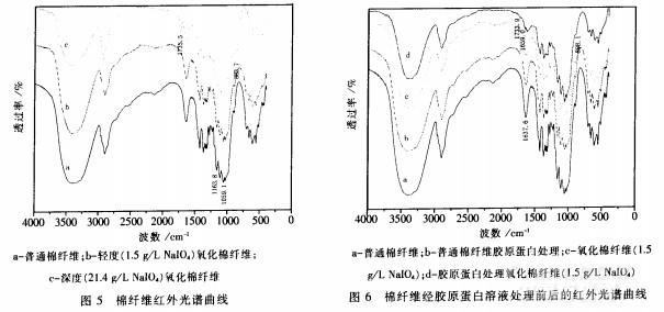 图5为棉纤维经高碘酸钠不同程度氧化后的红外光谱曲线从图5可以看出,棉纤维经高碘酸钠轻度氧化后在l733.9cm-1处出现了醛基弱的肩状吸收峰;深度氧化后,l735.5cm-1处醛基吸收峰增强且变得尖锐,同时,l163.8cm-1,和l059.1cm-1处的羟基特征吸收峰逐渐消失。表明棉纤维葡萄糖环上C2、C3位上的仲羟基被氧化成醛基。另外,深度氧化后883.7cm-1处的半缩醛吸收峰明显增强,说明随着氧化程度的加深,氧化生成的醛基与纤维素大分子上普通羟基之间的羟醛缩合也逐渐加强。