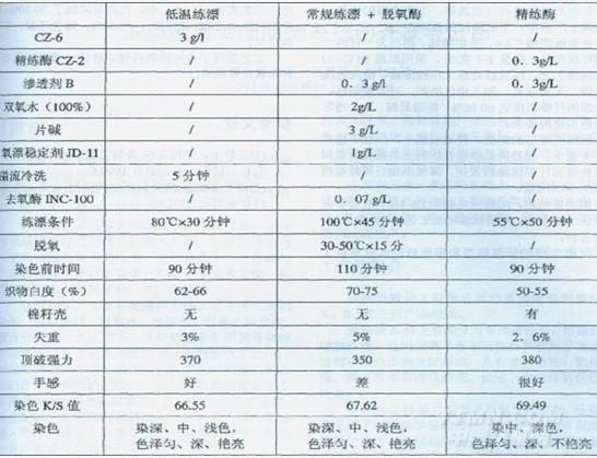经CZ-6低温练漂,不使用烧碱、强腐蚀性的双氧水和渗透剂、稳定剂等多种助剂。练漂后工作残液pH值小于9,COD、BOD值比常规烧碱、双氧水工艺低,练漂后水洗次数及用水量减少,减轻污水处理压力,满足清洁生产的要求。
