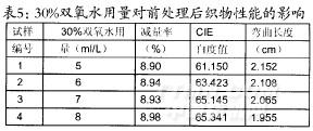 从表5中的数据可以看,随着双氧水用量的增加,减量率逐渐增加,但增加不明显;织物自度值逐渐增大;弯曲长度变短,柔软性能比较好。