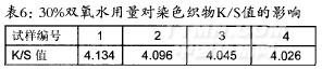 从表6中数据可以看出,随着双氧水用量的增加,染色后织物的K/S值逐渐减小,这说明随着双氧水用量的增加,提高了织物的白度,所以染色后织物的表观色深降低。