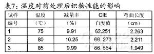 退煮漂一浴一步法前处理工艺条件:浴比l:30,时问30min,硅酸钠5g/L,平平加一00.5g/L,渗透剂B2g/L,酶用量5g/L,30%双氧水用量8ml/L,pH值为8,温度分别设定为75、80、85,经处理后的织物性能见表7。
