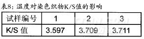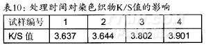 从表l0中数据可以看出,随着处理时问的增加,染色后织物的K/S值逐渐增大,说明双氧水处理时间增加,织物白度增强,染色后织物的表观色深则降低。