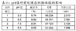 退煮漂一浴一步法前处理工艺条件:浴比1:30,时间35min,硅酸钠5g/L,平平加一O0.5g/L,渗透剂B2g/L,酶用量5g/L,30%双氧水用量8ml/L,温度为80%,处理液pH值分别为5.5、6.5、7.5以及8.5,经处理后的织物性能见表11。