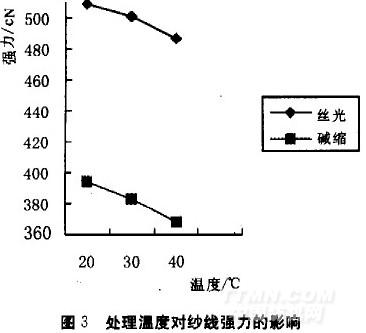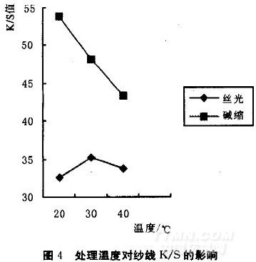 测量经不同温度烧碱双丝光及两次碱缩后纱线的强力及染色性能、吸附性能的变化,结果如图3、图4所示。