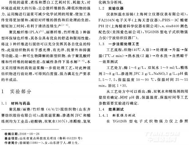 关键词:聚乳酸纤维;混纺织物;前处理;一步法;清洁生产
