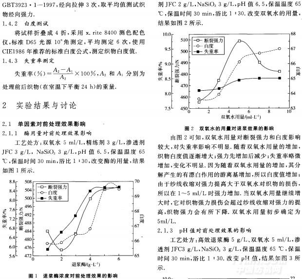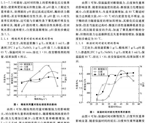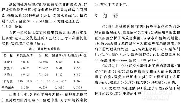 摘要:采用高效退浆酶一步法对聚乳酸/丽赛/竹(4/4/2)混纺织物进行前处理,通过白度、断裂强力和失重率指标进行评价,分别对高效退浆酶、双氧水和精练剂的用量、pH值、保温温度和保温时间进行单因素实验研究,得出合适范围,通过I(4j)正交试验,进一步确定上述因素对前处理的影响,找出高效退浆酶一步法前处理最佳工艺.实验结果表明高效退浆酶一步法前处理工艺能满足聚乳酸/丽赛/竹混纺织物的后续生产要求并有利于清洁生产.