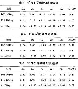 以4试样作为标准,5试样测色对比结果见表4。以4试样作为标准,6试样测色对比结果见表5。以5试样作为标准,6试样测色对比结果见表6。