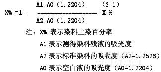 用分光光度计在最大吸收波长处测定染色前后染液的吸光度,按照下列公式计算。