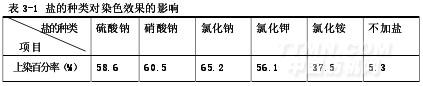 从上表中可以看出,加盐后上染率明显提高,这可能是因为活性染料是阴离子型染料,而纤维素在水中也带负电荷,加盐后,盐可以电离出正负离子,纤维对带有异号电荷的正离子的吸引,中和了纤维所带的部分电量,减少了染料离子与纤维间的静电斥力,从而起到促染作用。在所选择的不同盐中,以氯化钠为盐的效果最好,氯化铵的效果最差,这可能是因为氯化铵性质不稳定,染色时,会分解。因此综合考虑选用氯化钠作为促染剂。