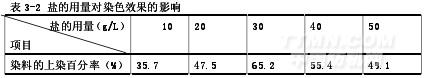 从上表中可以看出,当增加盐的用量,上染百分率逐渐增加,当盐用量增加到30g/L以后再继续增加盐用量,上染百分率反而呈下降趋势,这可能是因为加盐后起到促染作用,但用量越大,影响染料的溶解,因此上染百分率反而下降。盐量为30g/L为最佳用量。