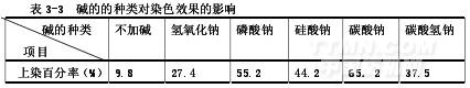 改变碱分别为:NaOH、Na3PO4、Na2SiO3、Na2CO3和NaHCO3,其他条件相同的情况下,分别为K型B-3RS黄4%、氯化钠30g/L、碱20g/L、染色温度60℃、浴比为1:50、染色时间为75min。得到结论如表4所示,见下表: