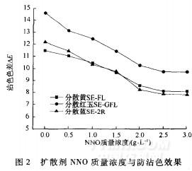 从图中可看出,扩散剂NNO对棉纤维具有很好的防沾色效果,随着扩散剂NNO质量浓度的增加,3种分散染料的沾色色差△E都明显降低。扩散剂NNO属于阴离子型表面活性剂,分散染料为非离子型染料,不含有水溶性基团,疏水性强,难溶于水,但易通过增溶作用增溶于扩散剂NNO胶束中。棉纤维在溶液中表面带负电荷,扩散剂NNO形成的胶束外层也带有负电荷,二者斥力很强,所以其胶柬很难吸附到棉纤维上,这样扩散剂NNO对棉纤维应该具有很好的防沾色效果。当扩散剂NNO质量浓度达到2.5g/L时,再增加用量,防沾色效果增加不明显,从节约成本的角度考虑,染色工艺中扩散剂NNO质量浓度选用2.5g/L。