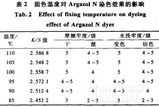 ArgazolN系列活性染料无需碱剂固色,其在中性条件下通过高温作用固色。研究不同温度下的固色效果,确定ArgazolN系列活性染料的最低固色温度,试验结果如表2所示。