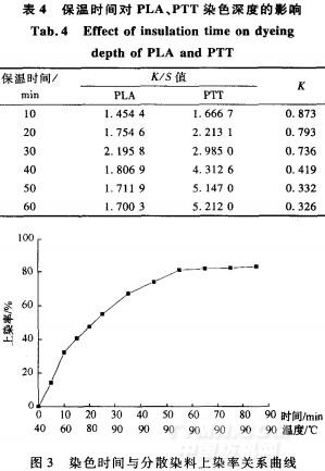 PLA、PTT虽都是聚酯结构,都可用分散染料进行染色,但它们的具体分子结构差异较大,决定了二者在同时染色时对同种分散染料亲和力存在差异,加之PLA/棉/PTT3组分包芯纱针织物中PLA、PTT组分混纺比例不同,染色时,同一染料用量下,染料对PLA、PTT3组分的质量分数也不同,所以PLA、PTT组分染色效果就会存在差异。按照PLA/棉/PTT 3组分包芯纱针织物中PLA、PTT组分的混纺比例,称取相同质量比的纯PLA、PTT纱线进行染色试验,测试不同保温时间下PLA、PTT织物的染色深度,进而得到同色平衡指数,结果如表4所示。分散染料上染率与染色时间的关系如图3所示。
